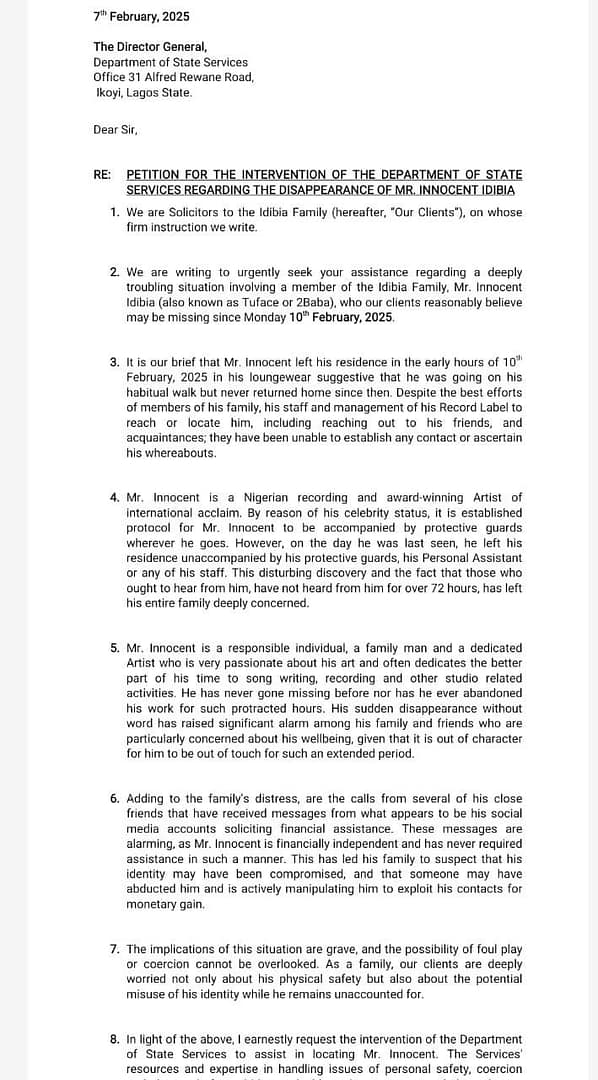 Nigerian music icon Innocent “2Baba” Idibia has been reported missing by his family, who have filed an official petition with the Department of State Services (DSS) seeking urgent intervention.