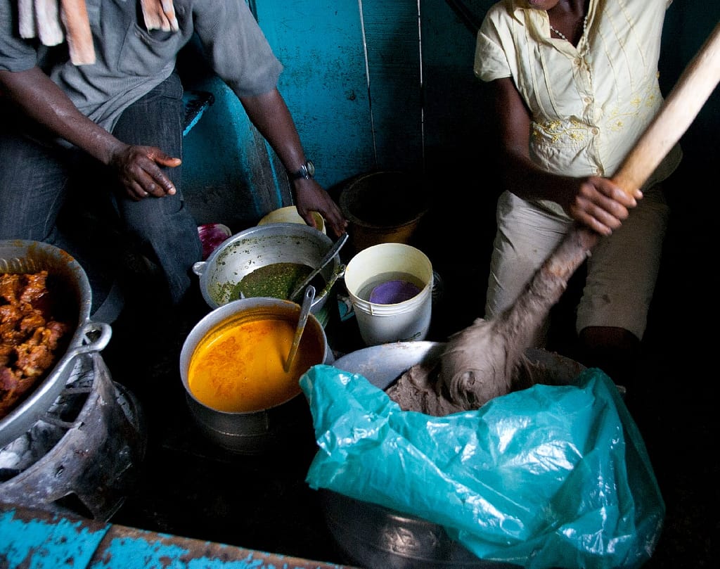 also be made from cassava or plantain. The flour is cooked with water, turning it into a